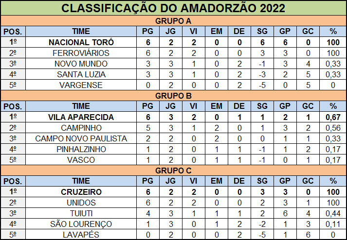 As equipes do Novo Mundo (Grupo A), Vila Aparecida (Grupo B) e São Lourenço (Grupo C) estarão de folga nesta rodada.