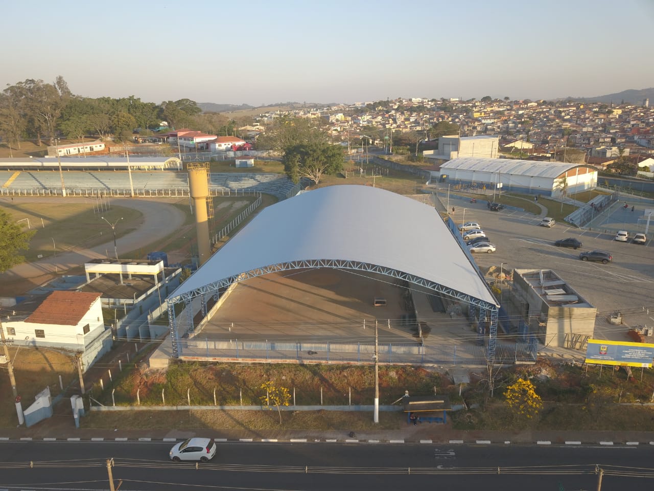 As obras de construção da quadra poliesportiva no Complexo Esportivo Rivelino de Oliveira Dorta alcançaram 76% da conclusão nesta semana. Atualmente, a equipe está finalizando a cobertura do vestiário e iniciando a construção do guarda corpo das rampas de acesso.