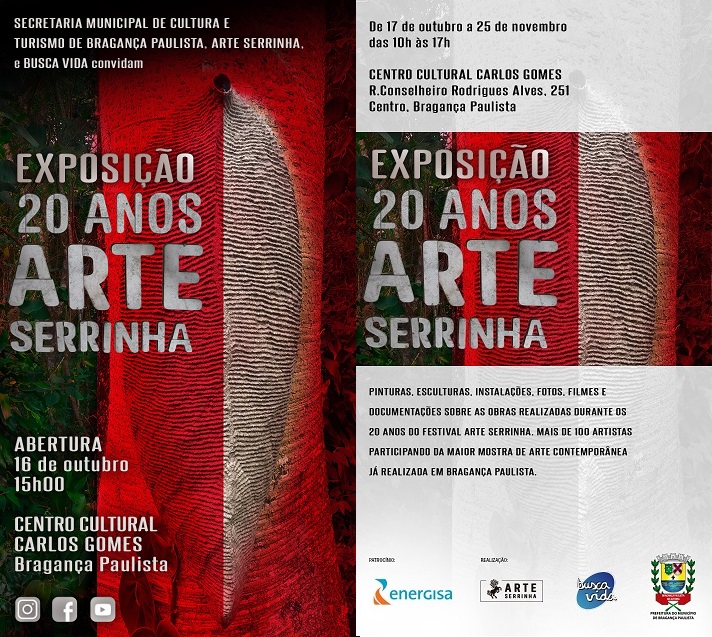 O Festival Arte Serrinha é um dos mais consolidados e reconhecidos do cenário cultural nacional. Há 20 anos, realiza atividades que unem arte, cultura e natureza na zona rural de Bragança Paulista e, agora, ocupa o Centro Cultural Teatro Carlos Gomes com parte dessa história, em uma exposição de artes visuais que abre às 15h do próximo sábado, 16, e fica até o dia 25 de novembro.