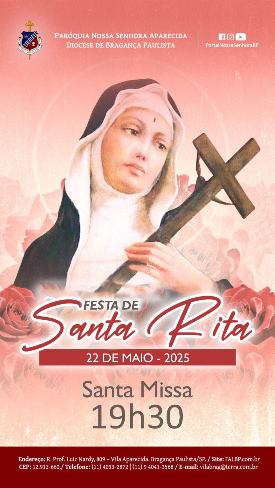 Nesta quinta-feira, 22 de maio, Dia de Santa Rita de Cássia — conhecida como a Santa das Causas Impossíveis —, a Paróquia Nossa Senhora Aparecida realizará uma celebração especial em homenagem à santa.