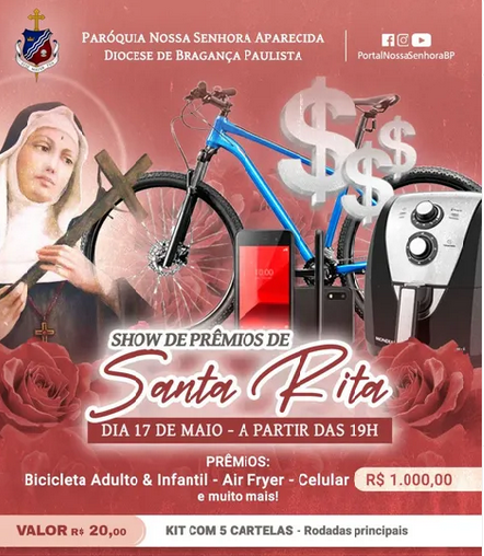 O destaque da programação será no sábado, 17 de maio, com a Novena Solene às 18h, seguida, às 19h, do aguardado Show de Prêmios, no salão paroquial. A cartela principal custa R$ 20,00, e os participantes concorrerão a diversos prêmios, como bicicletas (adulto e infantil), air fryer, celular, R$ 1.000,00 em dinheiro, entre outros brindes.