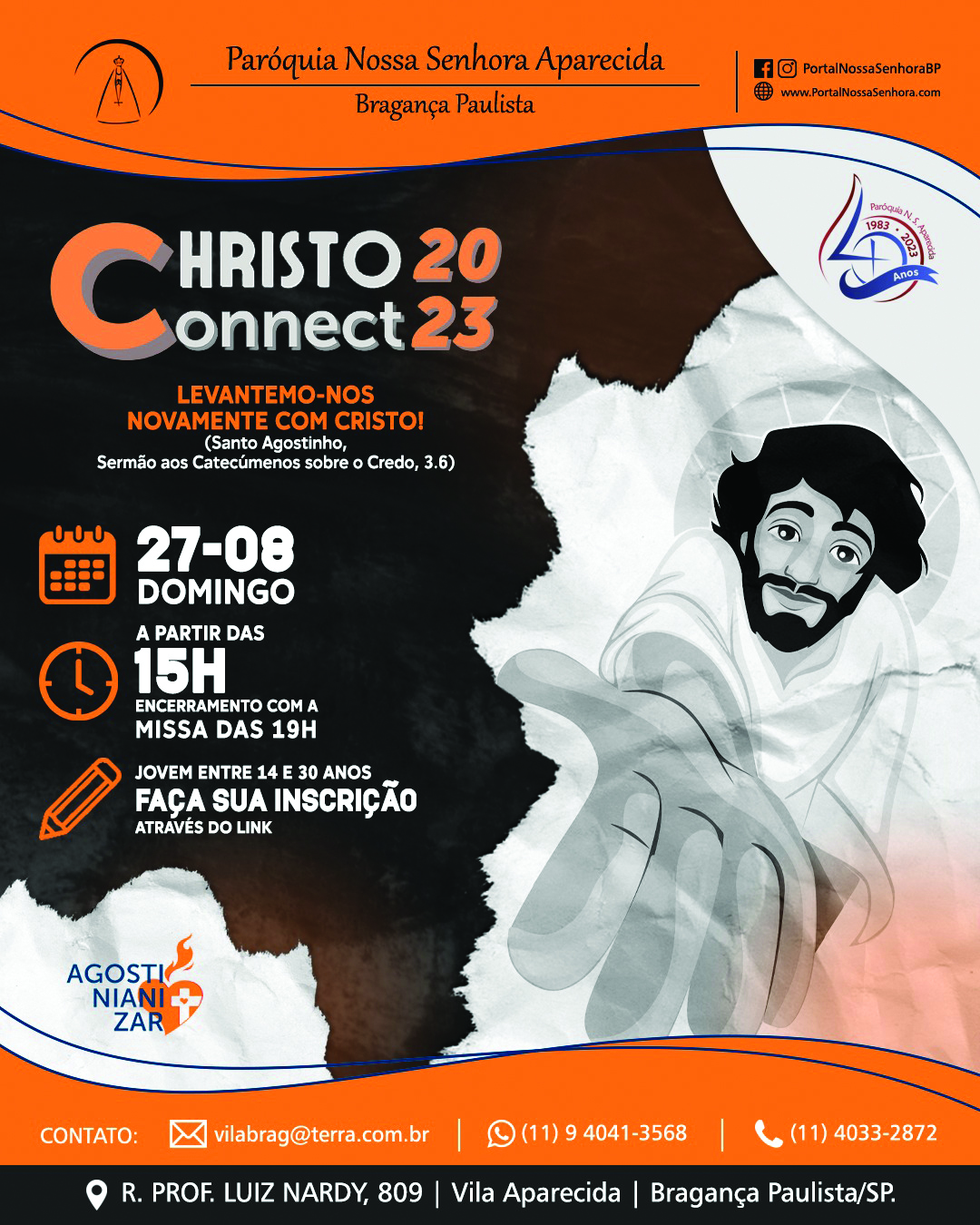 A Paróquia Nossa Senhora Aparecida, localizada na Vila Aparecida, em Bragança Paulista, está comemorando 40 anos de presença agostiniana. Para tornar essa data ainda mais especial, o Secretariado de Animação Vocacional e Juvenil está organizando o evento religioso “Christo Connect 2023”, voltado para todos os jovens de “coração inquieto”, a ser realizado no último domingo deste mês, véspera do dia de Santo Agostinho.