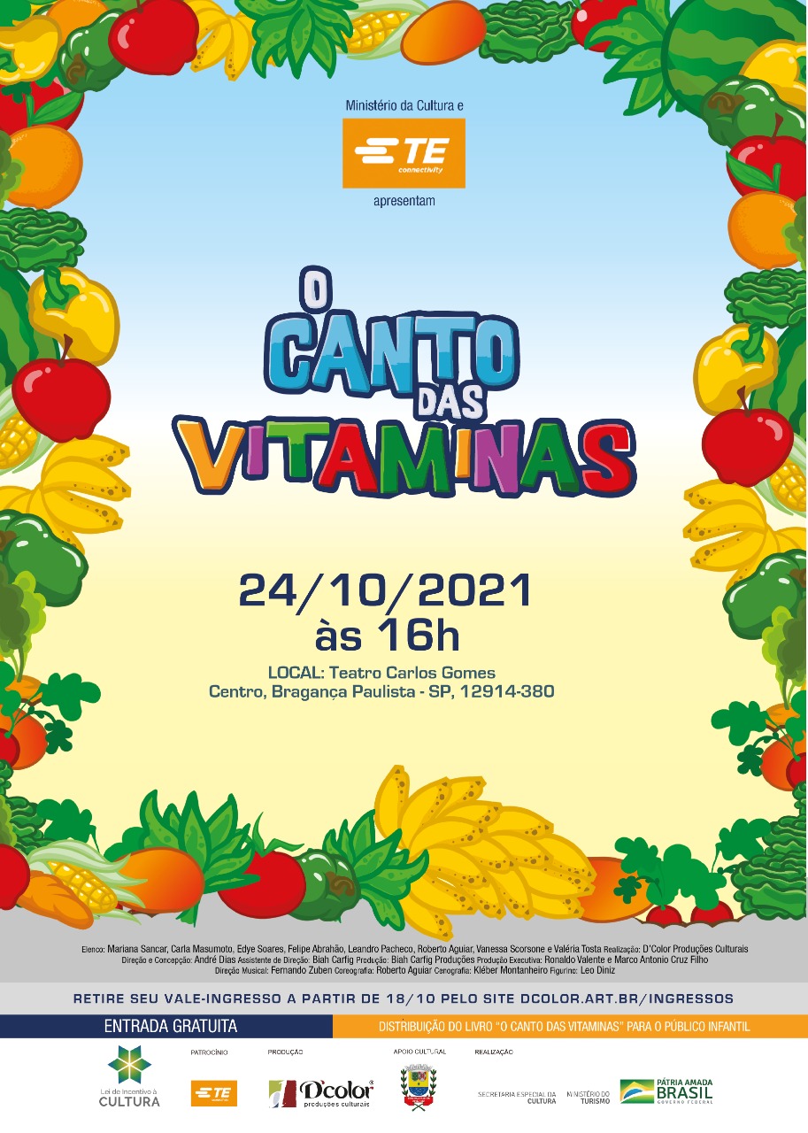 Com entrada gratuita, para assistir a peça é preciso realizar um cadastro prévio e apresentar o QR Code gerado na entrada. Os ingressos estarão disponíveis a partir de segunda, 18, pelo link: http://www.dcolor.art.br/site/agenda/495/2021/10/espetaculo-teatral—o-canto-das-vitaminas—braganca-paulista-sp/.