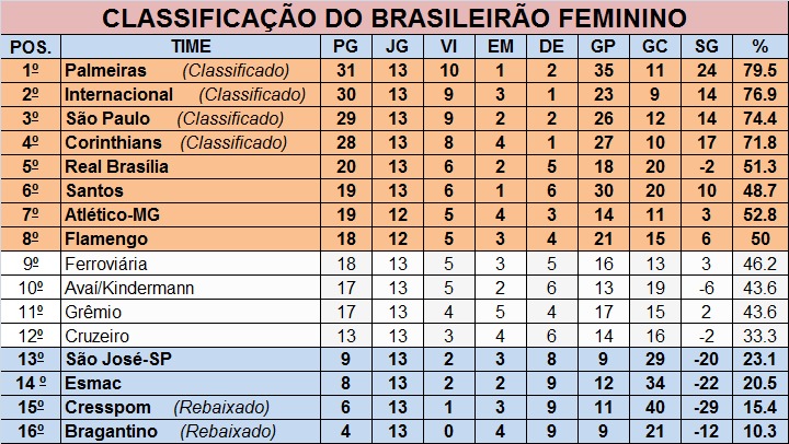 O Braga, que já está rebaixado para Série B no ano que vem, acumula quatro empates em 13 jogos disputados. Com apenas quatro pontos ganhos, a equipe está na última colocação na classificação do campeonato nacional. Outro time que também foi rebaixado nesta rodada é o Cresspom-DF que foi goleado pelo Palmeiras por 7 a 1. O time do Distrito Federal tem 6 pontos e mesmo que vença seus dois últimos jogos não alcança o Cruzeiro, primeiro time fora do Z4.