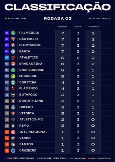 Mesmo com a derrota, o Bragantino segue com seis pontos conquistados e permanece entre os seis primeiros colocados da competição nacional neste início de campeonato.