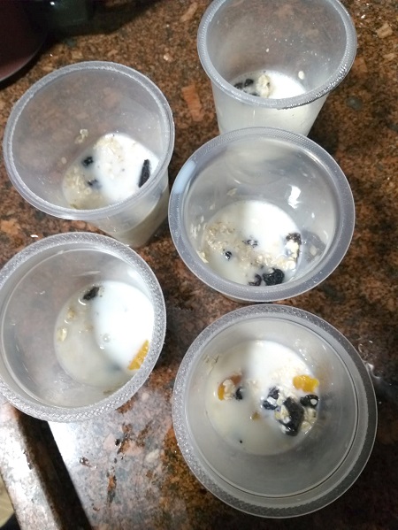 Exatamente como a dona do post, que começa o vídeo comentando que “não é de ficar testando as receitinhas que aparecem no celular” (e lá estava ela preparando a aveia), fui eu para a cozinha fazer também, aproveitando que estava quase na hora de deitar e era o momento exato do preparo, pois a aveia dormida precisa descansar na geladeira pelo menos 5 horas para depois degustar.