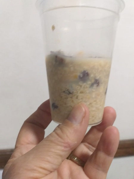 O resultado foi aprovado. Não coloquei fruta fresca, nem semente, nem geleia ou iogurte, que eram as sugestões dadas para incrementar a aveia depois de pronta. Eu comi no café da manhã do jeitinho que preparei, geladinha. Também levei de lanche da tarde na escola e ao natural também ficou bom. Faz aí, mas cuidado para não exagerar. Procure degustar uma porção ao dia, afinal, é opção para você evitar alimentos muito calóricos ou o pãozinho de todo dia.
