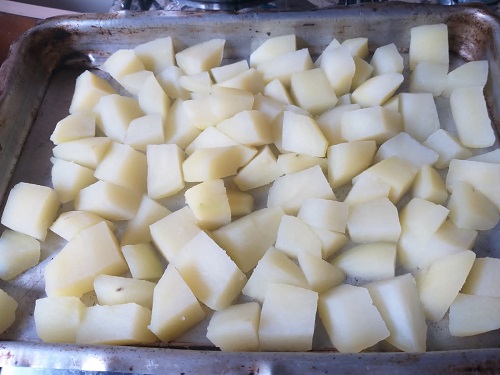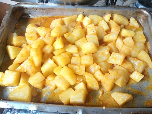 As batatas devem ficar ainda durinhas para acabar de cozinhar no forno.