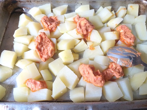 Coloque as batatas escorridas numa assadeira e, ainda quentes, espalhe sobre todas elas a pasta de margarina, alho e páprica, envolvendo-as igualmente.