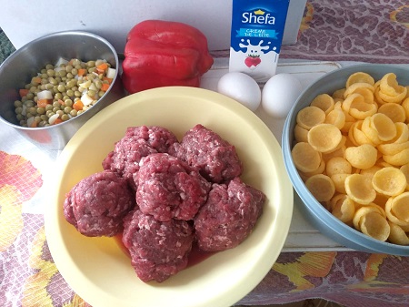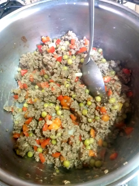 Numa panela, refogue a carne moída no óleo e temperos. Quando estiver quase seca, junte os legumes e o pimentão, misture, prove o sal e deixe no fogo mais alguns minutos. Junte a farinha de trigo para dar cremosidade à carne e despeje num pirex fundo.