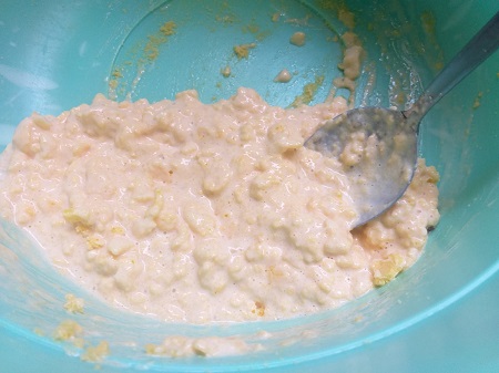 Coloque o salgadinho numa tigela funda e, com as mãos, esmigalhe até virar uma farofa. À parte, bata os ovos, junte o creme de leite e o queijo ralado e depois misture este líquido à farofa de fandangos reservada.