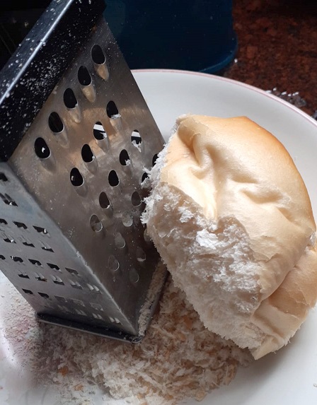Comece preparando o pão: Deixe o pão no sol até secar e depois rale em ralo grosso, com casca e tudo, e reserve.