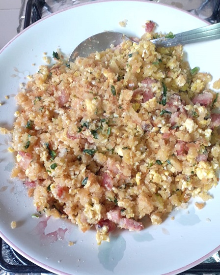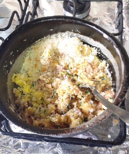 Depois de bem misturado, vá juntando o pão ralado e, por último, a salsinha.