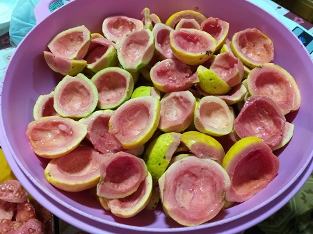 A receita não tem segredo, requer paciência e zelo para preparar e, na minha opinião, é uma terapia. Pegar fruta a fruta, retirar as sementes reservando para depois fazer a geleia (receita para a semana que vem), retirando as manchinhas pretas das cascas com delicadeza para preservar a polpa de cada fruta – cada uma vem do seu tamanho e em formatos diferentes: casca mais grossa, umas mais redondas, outras mais ovais, mas todas com o sabor e o perfume que o Criador escolheu para a goiaba.