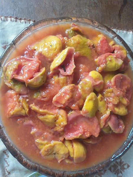 Domingo, o Luciano me presenteou com duas sacolas destas goiabas, que perfumaram o carro todo na volta de Tuiuti e, à noite mesmo, já preparei o doce e a geleia seguindo a receita da família, que, na verdade, só vai açúcar e cravo na medida certa.