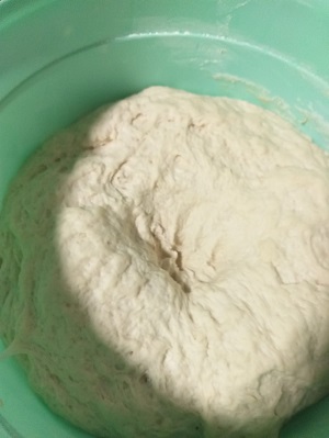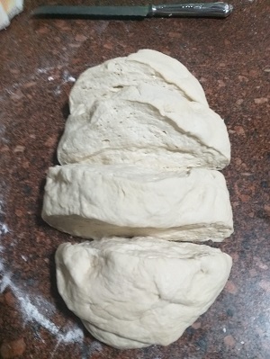 Unte a tigela com um pouco de óleo, faça a massa ficar com o formato redondo e coloque na tigela, cubra com pano e deixe em lugar abafado para crescer. Depois de crescido, feche o punho e abaixe a massa com a mão fechada, vire e deixe crescer novamente. Depois de crescida, reparta a massa em 4 partes.