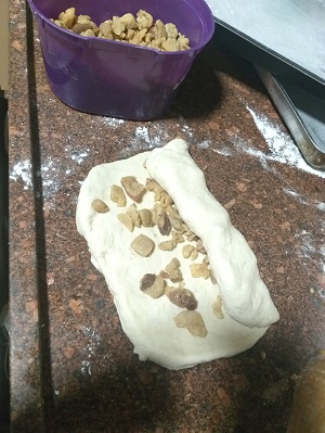 Abra cada parte da massa com as mãos ou rapidamente com rolo. Espalhe generosamente o torresmo por toda extensão da massa (pode ser calabresa ralada, linguiça, frango desfiado ou queijos diversos). Enrole esticando e puxando bem em cada dobrada para que fique bem compacto o rolo, coloque na assadeira e deixe crescer novamente.