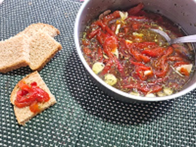 É este pimentão vermelho agridoce que tem um preparo rápido, sendo o mais demorado a retirada da pele, para que fiquem menos indigestos.