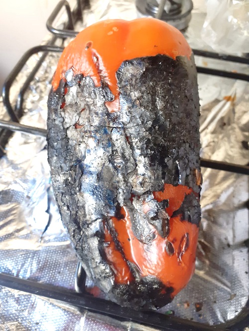 É muito simples de fazer, pois vai tudo no liquidificador; o que leva o maior tempo é tirar a pele dos pimentões (que é o que o deixa indigesto). Para isso, é necessário colocá-los um a um na chama do fogão até a casca ficar tostada, logo depois pô-los num saco de papel do tipo que vem os pães da padaria e fechar para esfriarem; e, depois de frios, lavá-los na água da torneira para que a pele saia totalmente.