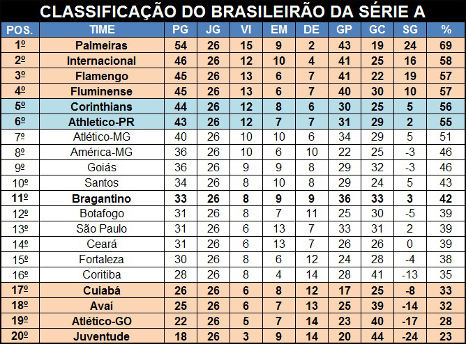 Apenas três pontos separam as duas equipes na tabela de classificação. O time Esmeraldino é o 9º colocado, com 36 pontos ganhos, enquanto o Braga está na 11ª posição, com 33. Vale lembrar que o Bragantino não vence uma partida no campeonato nacional há seis rodadas e, mesmo estando a sete pontos do Cuiabá, que é o primeiro time do Z4, o fantasma do rebaixamento já começa a incomodar a comissão técnica e os jogadores. Por isso, já passou da hora da equipe do Braga voltar a jogar bem e vencer.