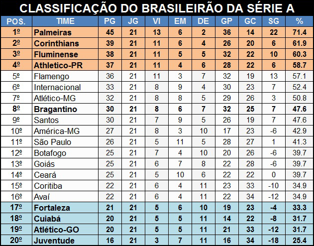 Mesmo com a derrota no último jogo, o Bragantino se manteve na oitava colocação da classificação do Campeonato Brasileiro, com 30 pontos ganhos. Já o Tricolor tem quatro pontos a menos que o Massa Bruta e ocupa a 11ª posição.