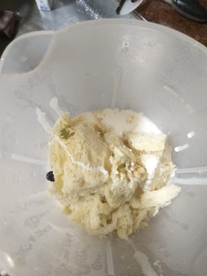 Com a ajuda de uma colher, sem “cavocar” até o fundo para não furar, vá retirando toda a massa do panetone e depois coloque no copo do liquidificador.
