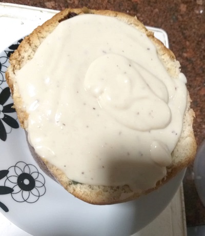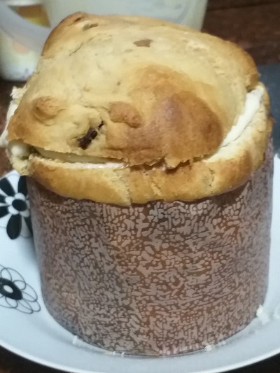 Despeje devagar este creme dentro do buraco do panetone até encher totalmente (caberá tudo, tenha paciência).