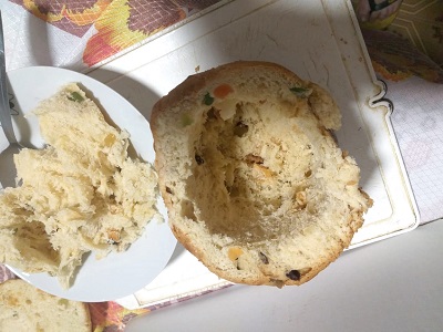 Com uma faca de ponta, corte delicadamente toda a volta do miolo do panetone (veja a foto), deixando cerca de 1 cm nas laterais.