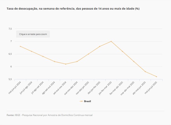 A taxa de desocupação no Brasil atingiu 5,6% no trimestre encerrado em julho de 2025, o menor percentual já registrado na série histórica do Instituto Brasileiro de Geografia e Estatística (IBGE), iniciada em 2012. Os dados da Pesquisa Nacional por Amostra de Domicílios (PNAD) Contínua, divulgados nesta terça-feira, 16 de setembro, revelam um cenário de fortalecimento do mercado de trabalho.