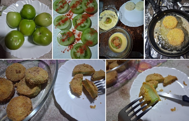 É um preparo que se faz na hora de servir, pois, deixando tudo ajeitado, depois de empanadas, as fatias devem ser fritas no óleo quente e logo serem servidas. No livro, segundo a autora, servia-se com fartas fatias de bacon, mas elas são totalmente desnecessárias, pois a “estrela” aqui são os tomates.