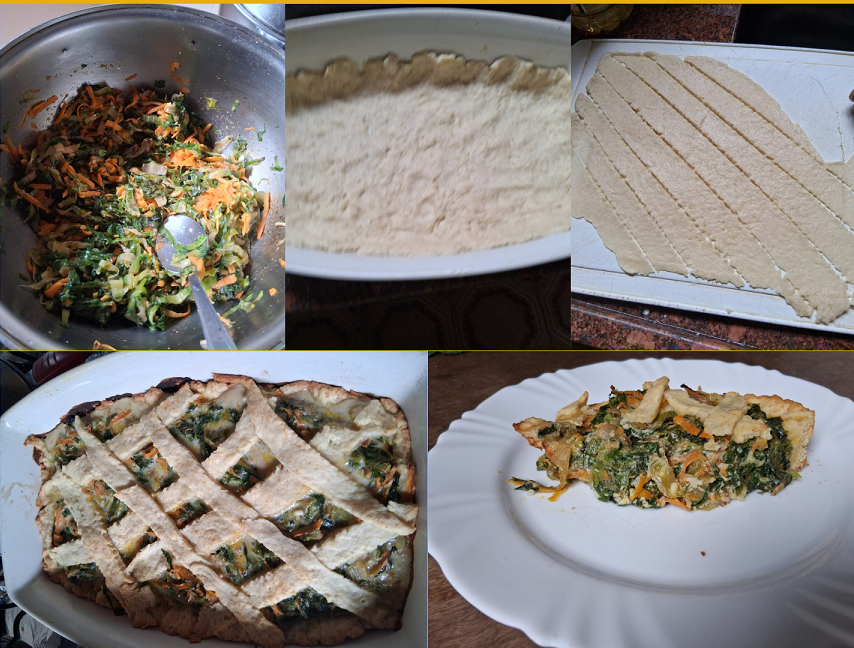 Estique o restante de massa, deixando-a fininha com rolo, e depois corte-a em tiras, dispondo em transversal sobre a escarola, de modo que forme um trançado sem cobrir toda superfície. Leve assar por cerca de 35 a 40 minutos em forno a 180ºC ou até que perceba que o ovo está cozido (talhado). Quente ou fria, é muito gostosa.