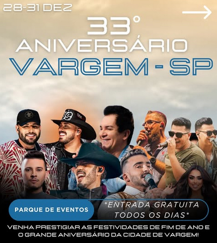 A cidade de Vargem está se preparando para uma grande festa em comemoração ao 33º aniversário de sua emancipação política e para as celebrações de final de ano. O evento, organizado pela Prefeitura Municipal, contará com uma programação diversificada e atrações musicais para todos os gostos no Parque de Eventos da cidade, com entrada gratuita.