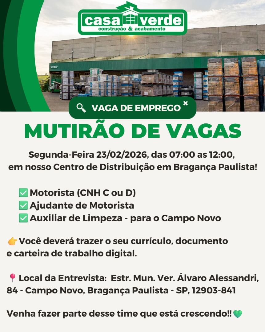 Está buscando uma nova oportunidade no mercado de trabalho? Essa pode ser a sua chance! A Casa Verde Construção & Acabamento, localizada em Bragança Paulista, realizará na próxima segunda-feira, 23 de fevereiro, das 7h às 12h, um mutirão de entrevistas com o objetivo de contratar novos profissionais para sua equipe. As vagas disponíveis são: Motorista (CNH C ou D), Ajudante de Motorista e Auxiliar de Limpeza, para trabalhar no Bairro Campo Novo.