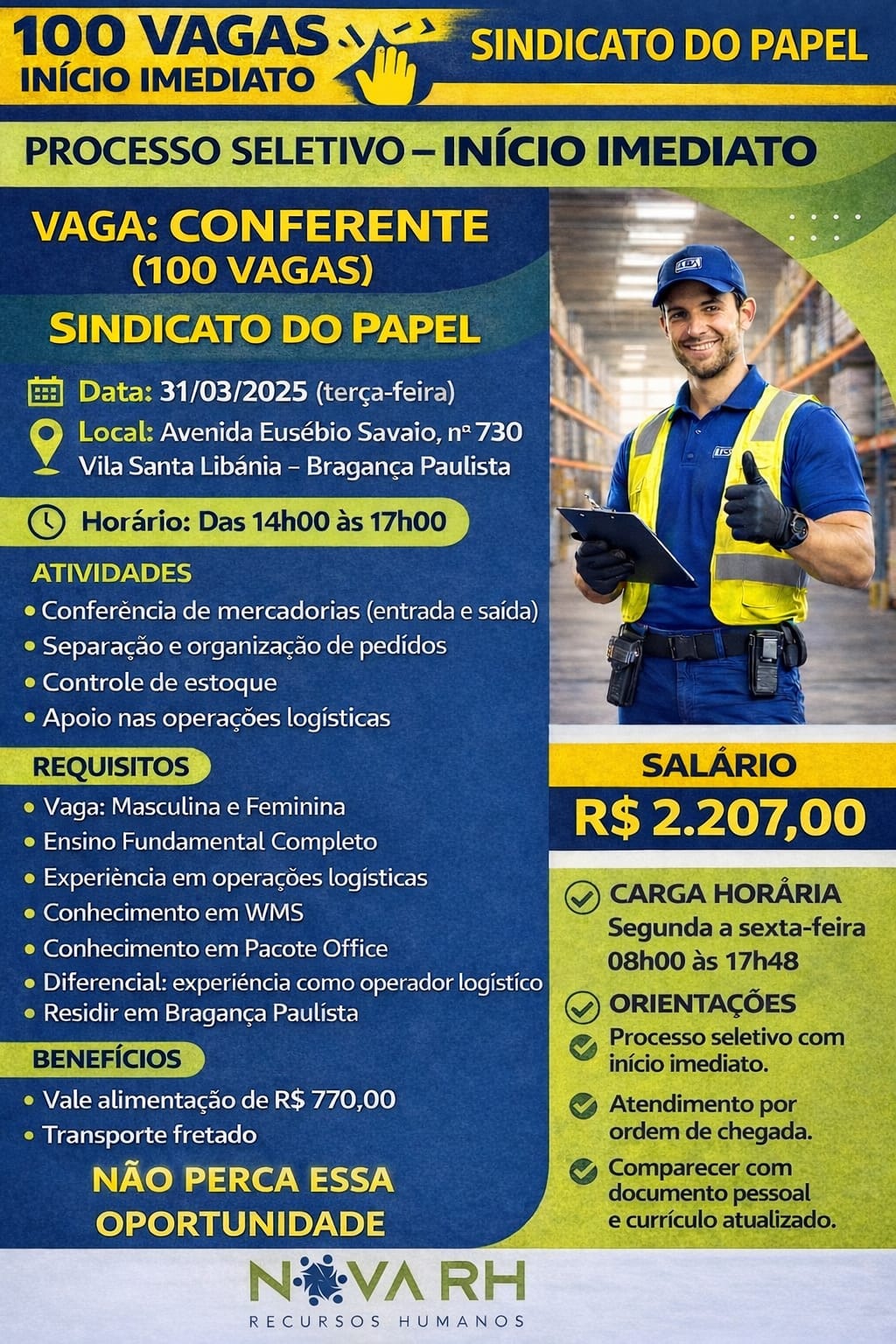 Em uma ação conjunta, o Sindicato do Papel e a agência Nova RH realizam, nesta terça-feira, dia 31, um mutirão de emprego voltado ao preenchimento de 100 vagas para o cargo de Conferente. O processo seletivo ocorre das 14h às 17h, na sede da entidade sindical, com foco em contratações de início imediato.