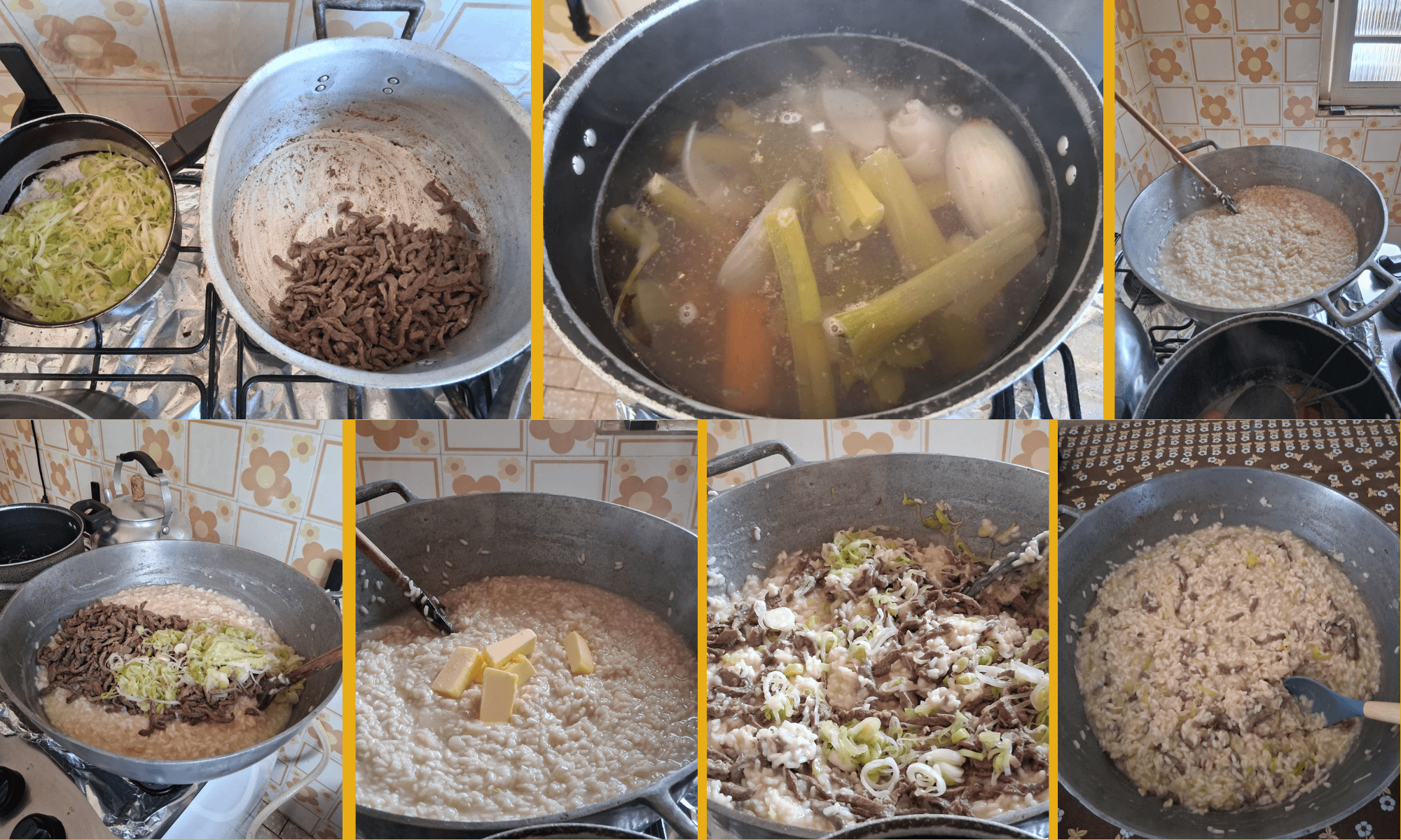 O preparo de risoto demanda tempo e paciência, pois o arroz é cozido com o caldo de legumes que deve estar fervendo numa panela ao lado para ser acrescentado aos poucos toda vez que o arroz começar a secar até chegar no ponto de cozimento ideal.