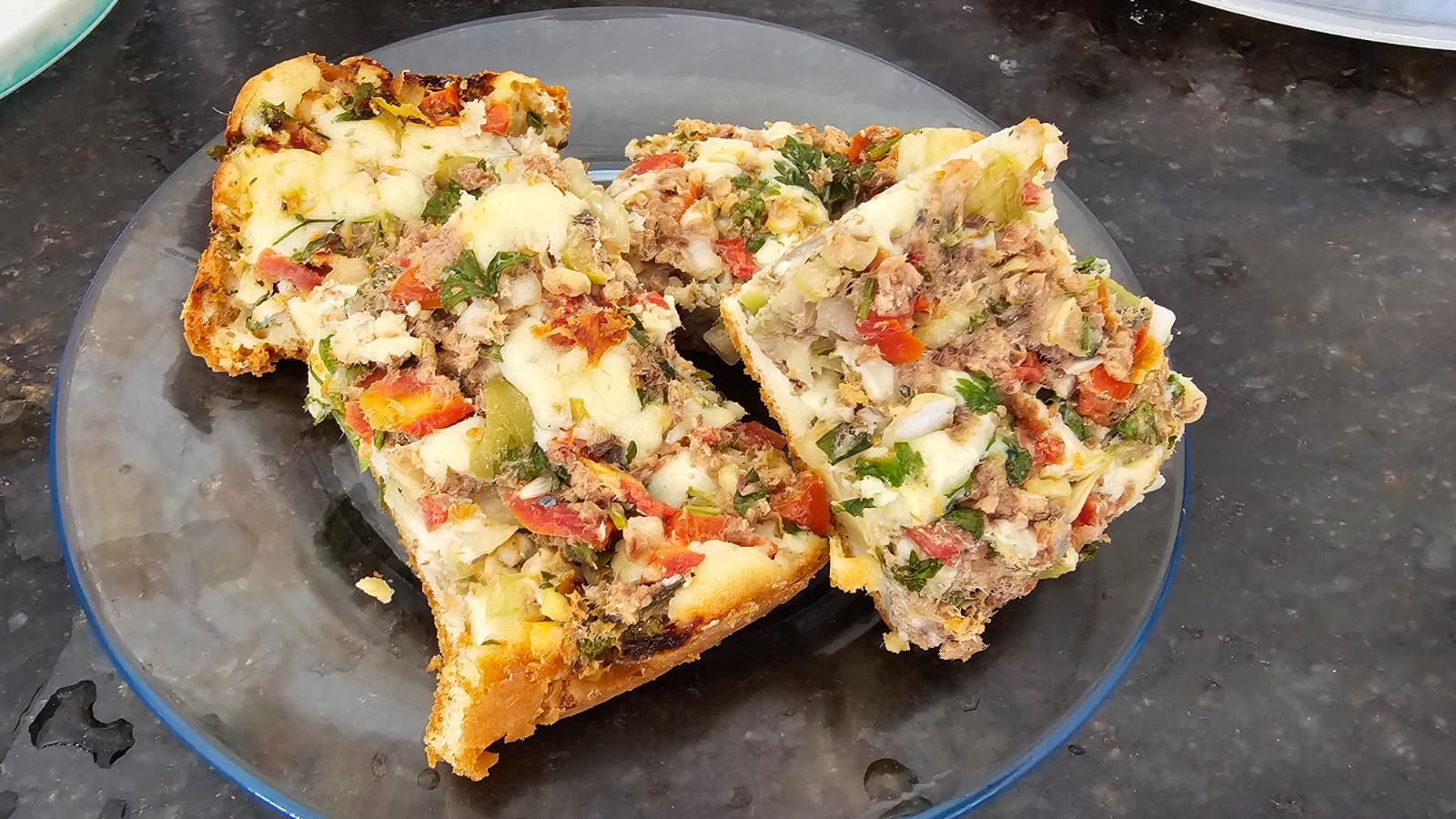 – Presunto, muçarela, tomate picadinho, temperos secos e cebola;