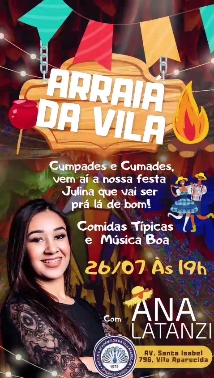 A tradicional festa julina da Vila está de volta! Terá comidas típicas, brincadeiras e muita animação. A partir das 21h, show especial com Ana Latanzi. Entrada franca.