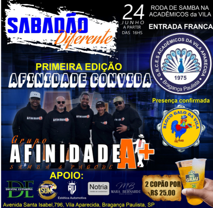 A Escola de Samba Acadêmicos da Vila promoverá no próximo sábado, 24 de junho, a partir das 16h, um evento especial intitulado "Sabadão Diferente" com a Primeira Edição "Afinidade Convida". A programação contará com muito Samba e Pagode, com a presença do Grupo Afinidade A+ e do Galo da Vila. O evento será realizado na quadra da Azul e Branco, conhecida como "Morada do Samba", localizada na Avenida Santa Isabel, 796, na Vila Aparecida. A entrada no recinto é gratuita e os participantes poderão adquirir 2 Copões de Drinks pelo valor de apenas R$ 25,00.