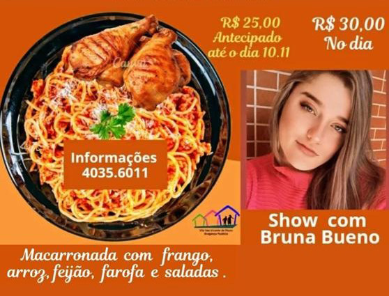 Neste domingo, 26, às 12h, o Asilo Vila São Vicente de Paulo, localizado na Av. Minas Gerais, 770, na Vila Bianchi, em Bragança Paulista, promoverá um Almoço Beneficente com música ao vivo. No cardápio, será servida macarronada com frango, arroz, feijão, farofa e salada. A cantora Bruna Bueno animará o evento com um show musical. Os ingressos antecipados estão sendo vendidos por R$ 25,00, enquanto no dia do evento o valor será de R$ 30,00. Para mais informações e adquirir os ingressos, entre em contato pelo telefone: 4035-6011.