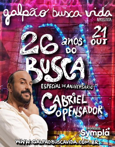 Comemorando seu aniversário de 26 anos de história, o Galpão Busca Vida traz, neste sábado, 21, a partir das 23h, o show com Gabriel, O Pensador, um dos cantores pioneiros do hip hop brasileiro. A abertura da casa será às 20h. O Galpão Busca Vida está localizado na Estrada da Serrinha, Km 03, em Bragança Paulista. Para adquirir os ingressos desta e das próximas atrações do Galpão, acesse o link: https://linktr.ee/galpaobuscavida.