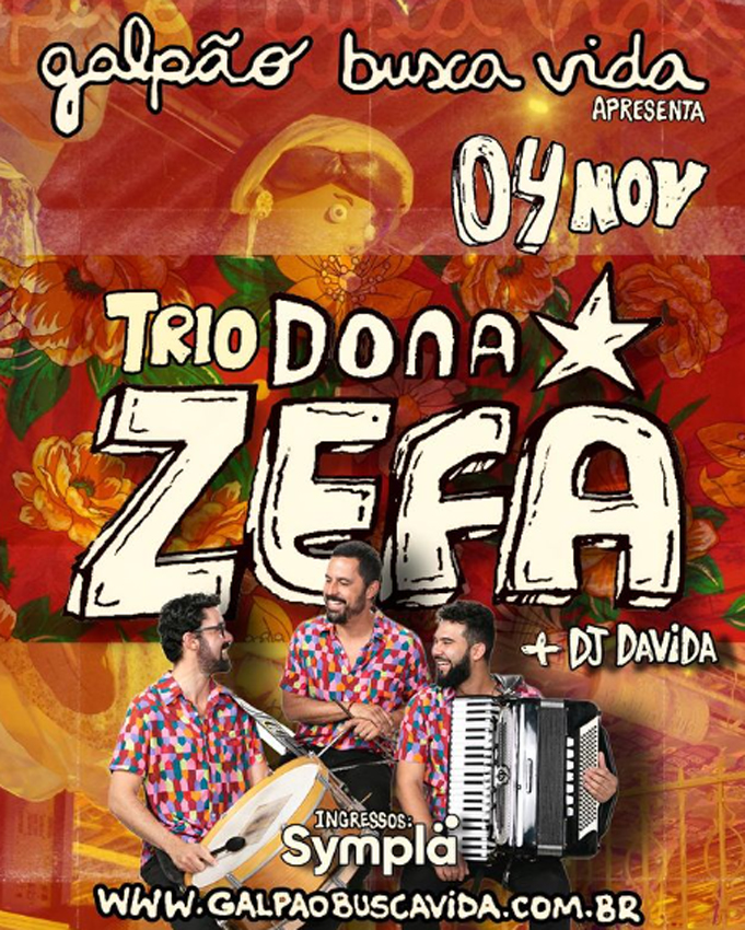 Neste sábado, 4, no palco do Busca, tem Trio Dona Zefa, um dos maiores grupos de forró tradicional da atualidade, com 20 anos de estrada. Além de viajar o Brasil inteiro, o trio já fez seis turnês internacionais e já lançou cinco CDs, dois LPs e um DVD. Entre as parcerias, estão grandes nomes como Dominguinhos, Genival Lacerda e Anastácia. Para adquirir os ingressos, acesse: linktr.ee/galpaobuscavida. O Galpão Busca Vida está localizado na Estrada da Serrinha, Km 3, em Bragança Paulista.