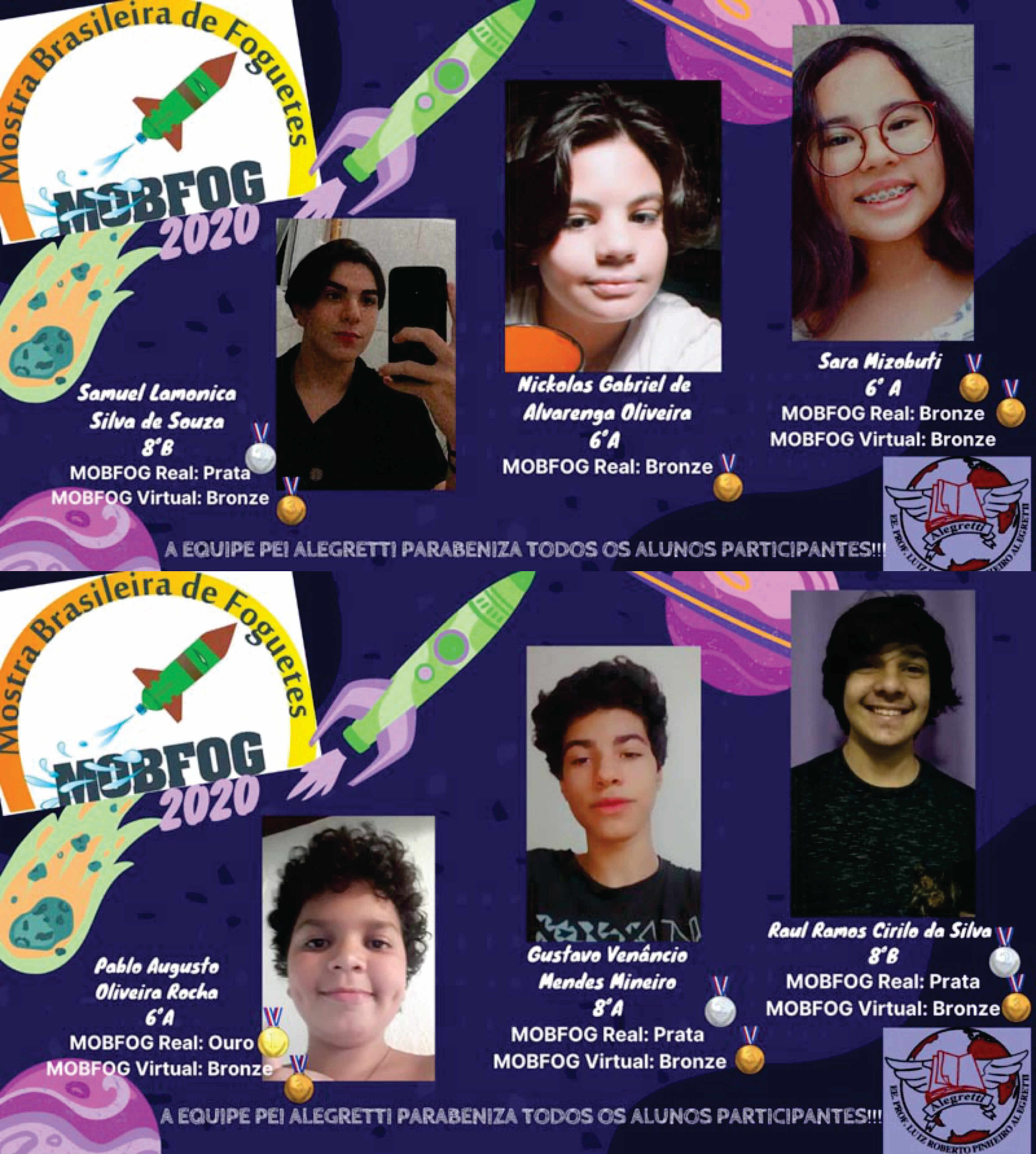 Alunos da E.E. Luiz Roberto Pinheiro Alegretti, em Bragança Paulista, que faz parte do Programa de Ensino Integral (PEI), conquistaram medalhas de ouro, prata e bronze em três olimpíadas: Olimpíada Brasileira de Astronomia e Astronáutica (OBA), Mostra Brasileira de Foguetes (Mobfog) e Olimpíada Nacional de Ciências (ONC). Apesar dos desafios trazidos pela pandemia do coronavírus, durante o ano letivo de 2020, os professores de Ciências, Roberto Fahl e Renata Oliveira, trabalharam simulados das provas anteriores da OBA e ONC e orientaram os alunos na confecção de foguetinhos.