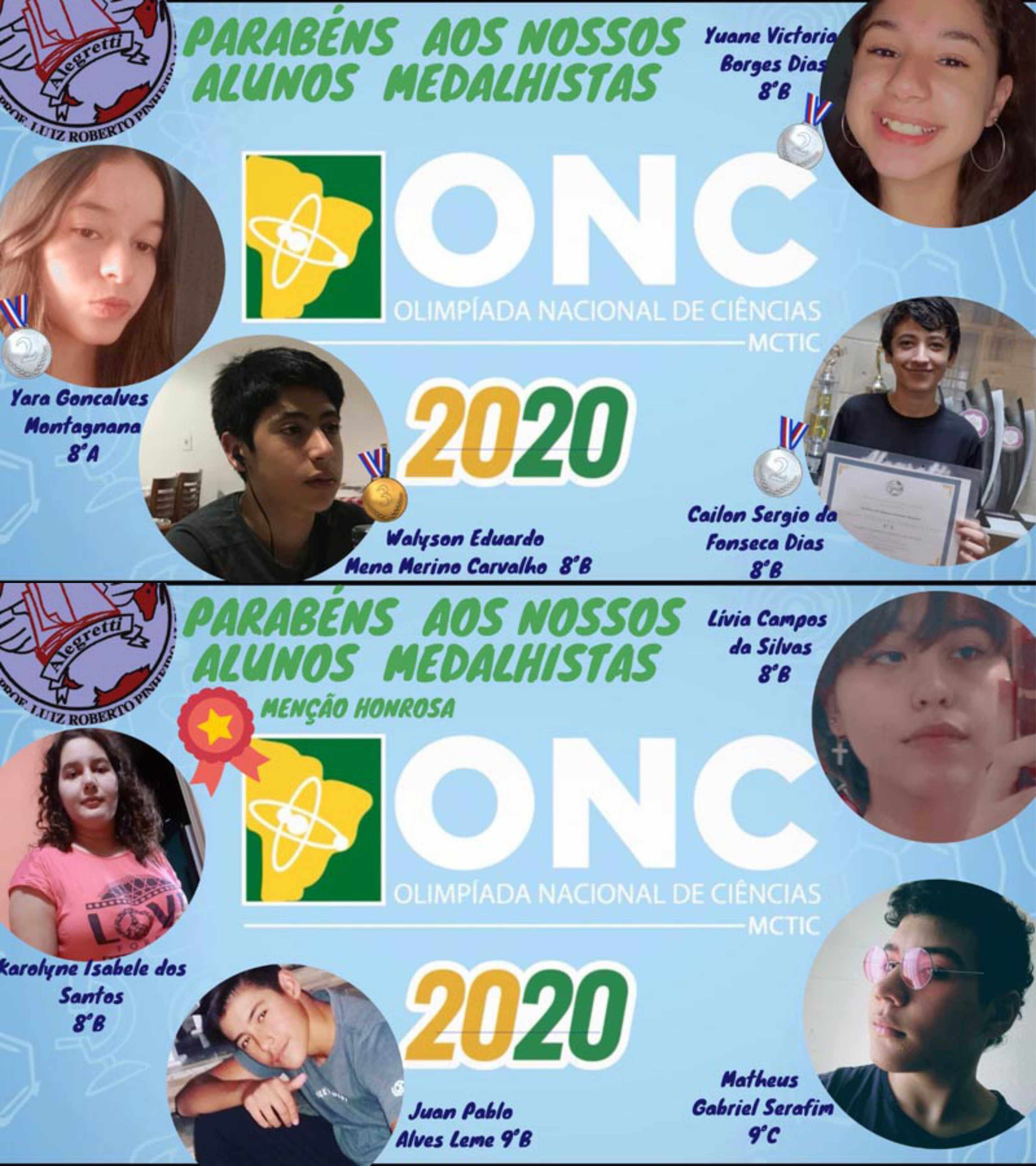 Já a Olimpíada Nacional de Ciências (ONC) integra o Programa Ciência na Escola e é uma realização de cinco Sociedades Científicas: a SBF (Sociedade Brasileira de Física), a ABQ (Associação Brasileira de Química), o Instituto Butantan, a Sociedade Astronômica Brasileira e a Universidade Estadual de Campinas (Unicamp). Ela resulta de um convite do Ministério de Ciência, Tecnologia e Inovação (MCTI) às sociedades e se destina a estudantes do Ensino Médio e do 8º e 9º ano do Ensino Fundamental. A primeira fase da ONC ocorreu entre 6 e 7 de agosto de 2020, e a segunda etapa, entre 22 e 23 de janeiro deste ano. Os alunos foram premiados conforme a pontuação obtida nas provas.