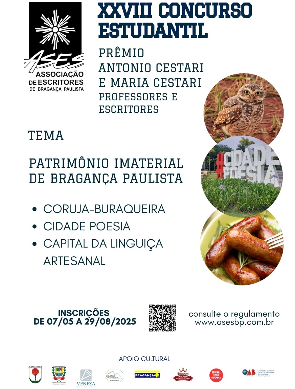 O tema proposto para este ano é “Patrimônio Histórico Imaterial de Bragança Paulista”, incluindo a ave-símbolo do município, coruja-buraqueira, para alunos do Ensino Fundamental I (1º ao 5º ano), e os epítetos Cidade Poesia ou Capital da Linguiça Artesanal para alunos do Ensino Fundamental II e Médio. Aos professores que desejarem concorrer em categoria própria, a entidade pede que escrevam sobre os três segmentos.