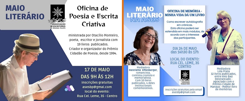 O Maio Literário terá continuidade neste sábado, 17, das 9h às 12h, com uma a oficina de poesia a ser ministrada pelo poeta Otacílio Monteiro. No dia 24, próximo sábado, acontece a Oficina de memória – minha vida dá um livro, ministrada pelas escritoras Henriette Effenberger e Lóla Prata.