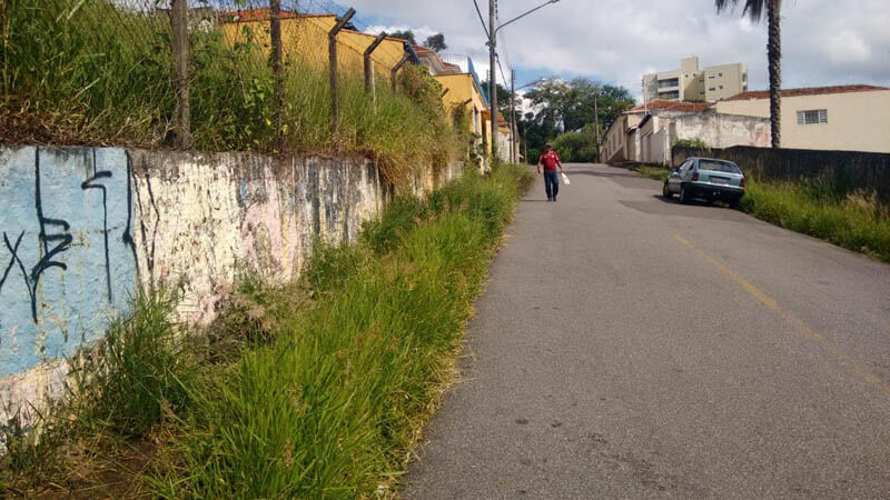Na Travessa da Abolição, o mato nas calçadas de ambos os lados da via é tanto que obriga os pedestres a andarem pela rua.