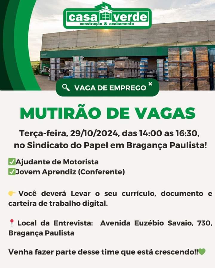 A Casa Verde Acabamentos e Construção, em parceria com o Sindicato do Papel de Bragança Paulista, realizará nesta terça-feira, 29 de outubro, das 14h às 16h30, um "Mutirão de Entrevistas" para selecionar candidatos para as seguintes vagas: Ajudante de Motorista e Jovem Aprendiz (Conferente). Informações sobre remuneração, benefícios e outros detalhes serão fornecidas durante as entrevistas.