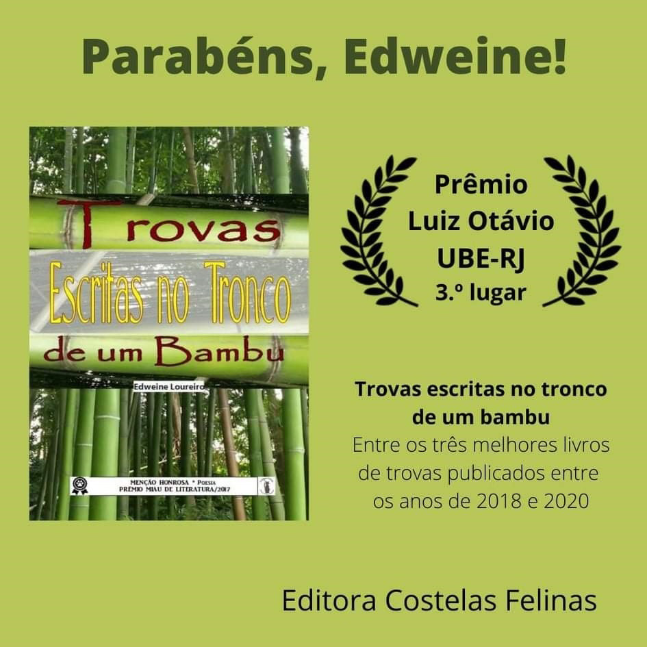O livro “Trovas escritas no tronco de um bambu”, de Edweine Loureiro, foi premiado com o terceiro lugar no Prêmio Luiz Otávio da UBE-RJ