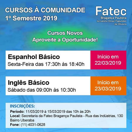 Estão abertas até sexta-feira, 15, as inscrições para cursos básicos de inglês e espanhol na Faculdade de Tecnologia (Fatec) Jornalista Omair Fagundes de Oliveira, de Bragança Paulista.