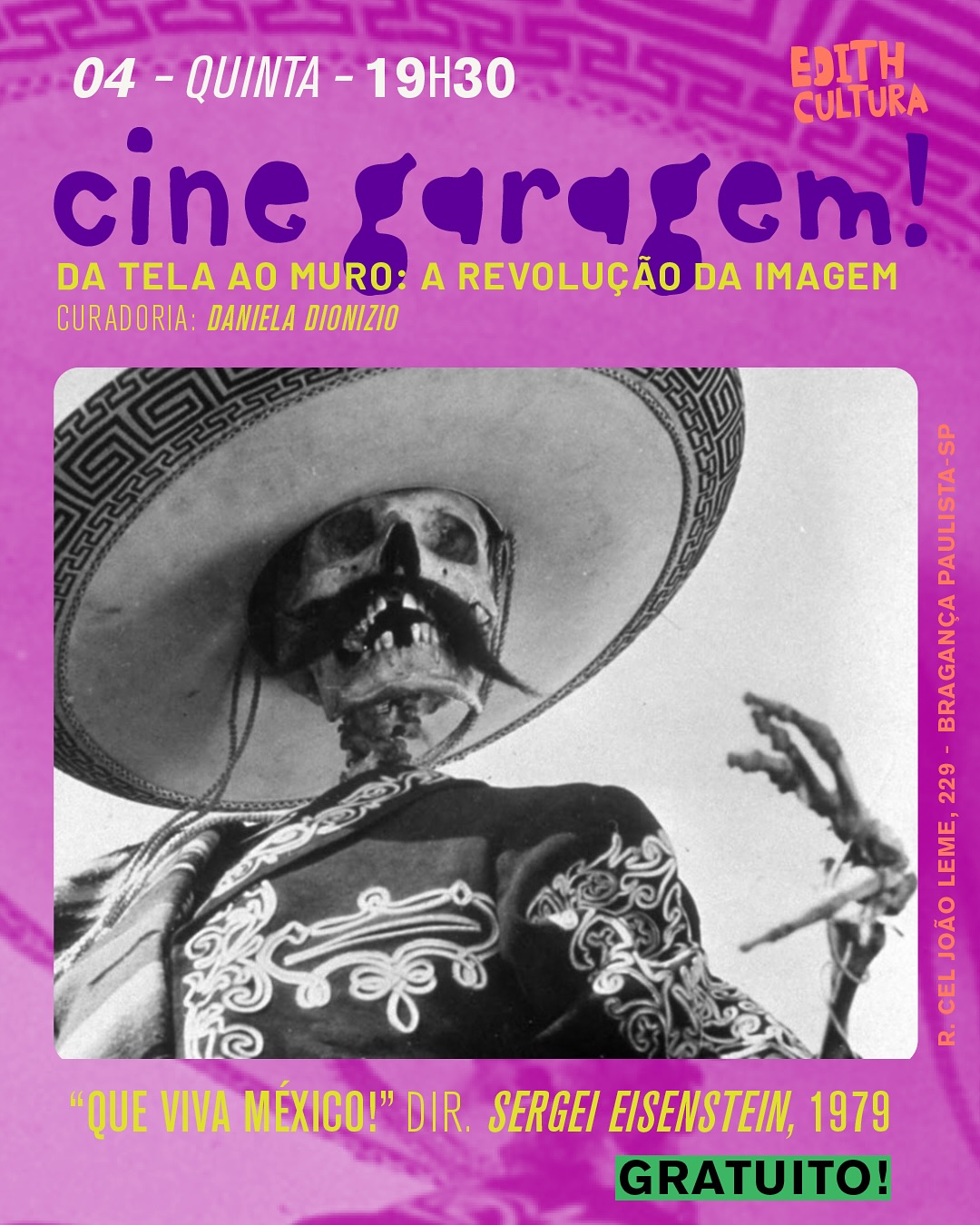 Começa nesta quinta-feira, 4, às 19h30, a mostra de setembro na Garaginha do Edith: “Da Tela ao Muro: A Revolução da Imagem”. Os filmes escolhidos pela curadora Daniela Dionizio apresentam a relação entre artistas da pintura de murais e cineastas da época, não apenas no aspecto visual, mas também na representação de lutas políticas em comum, como críticas à ditadura e ao genocídio indígena.